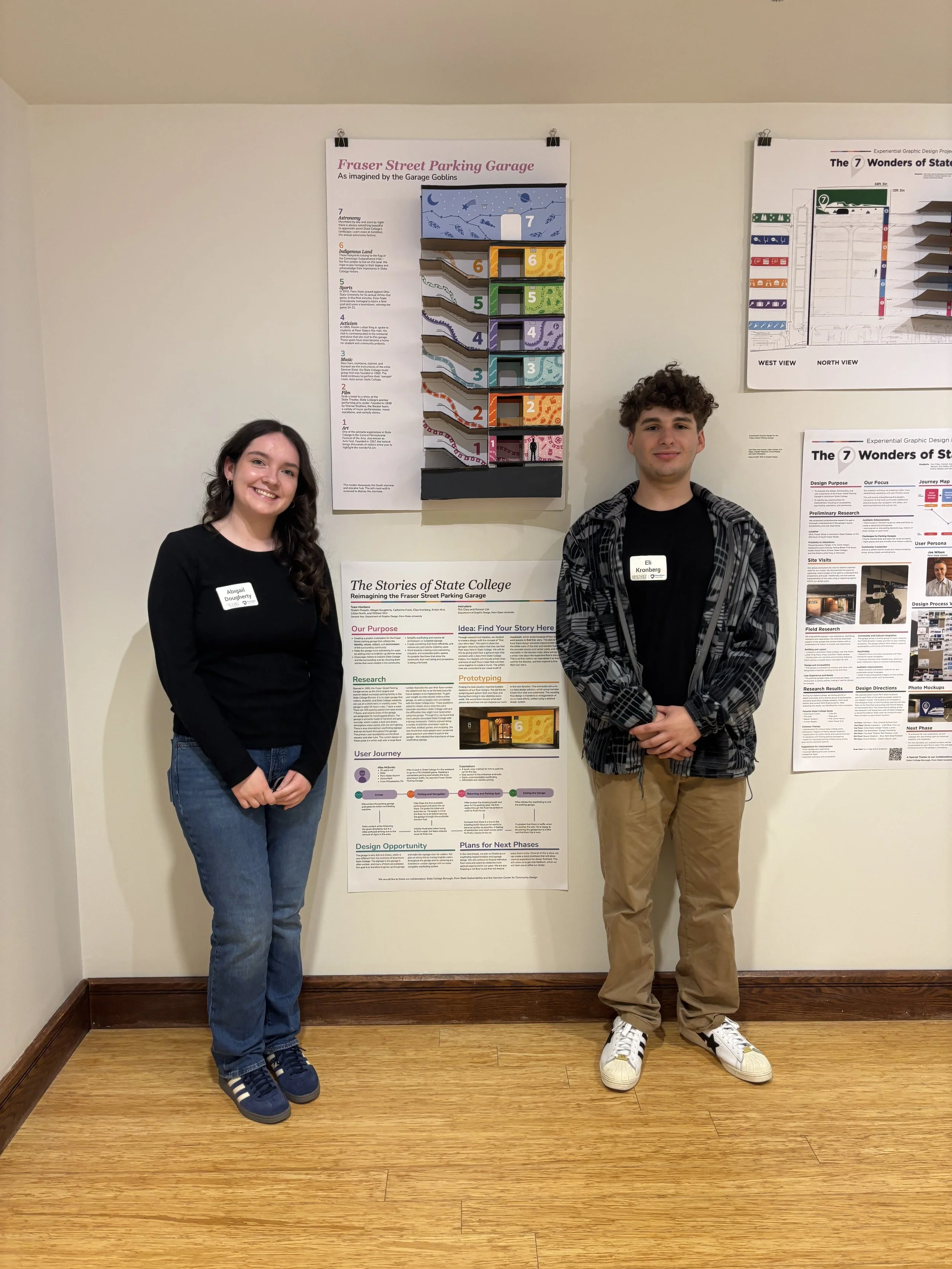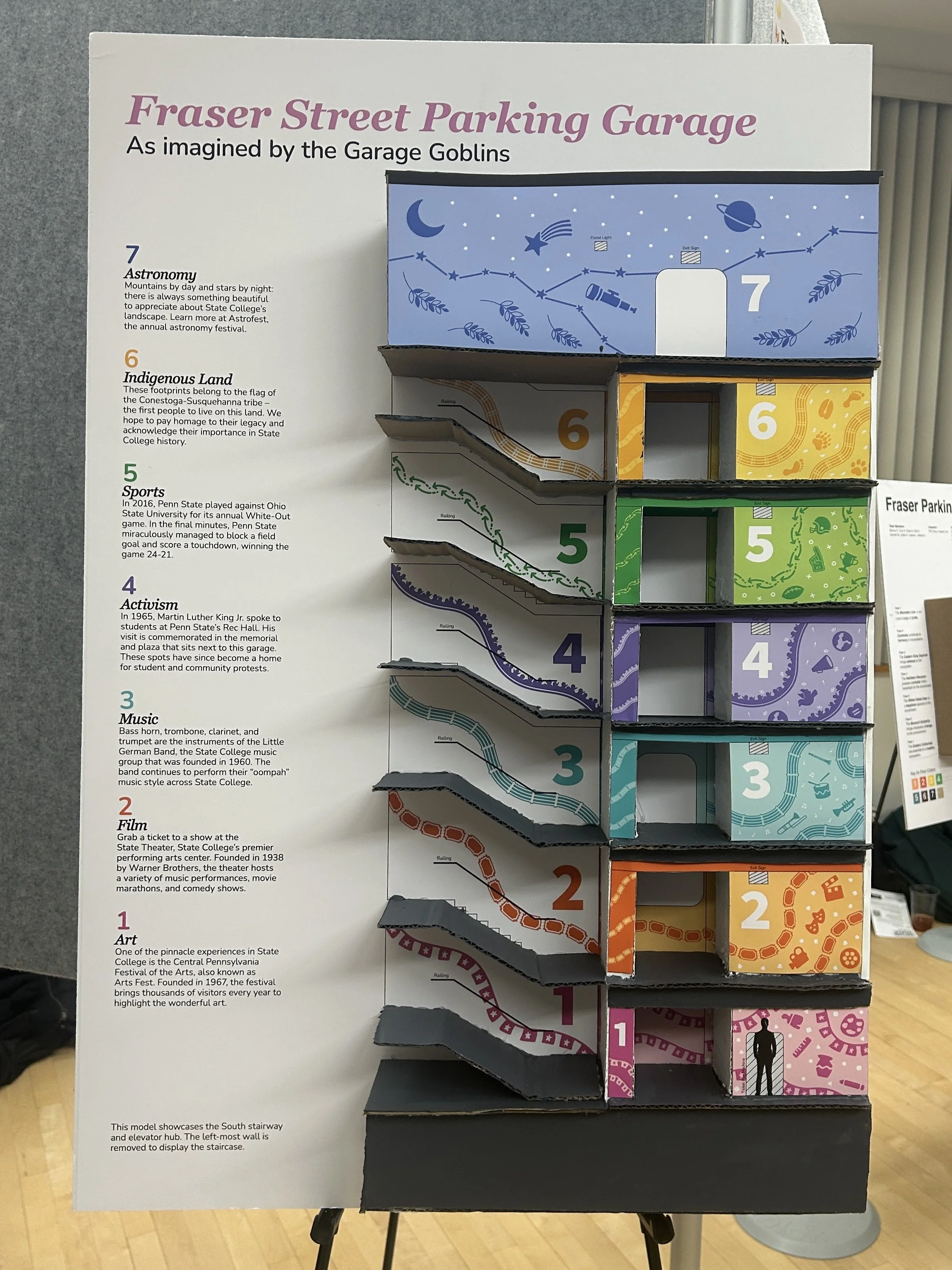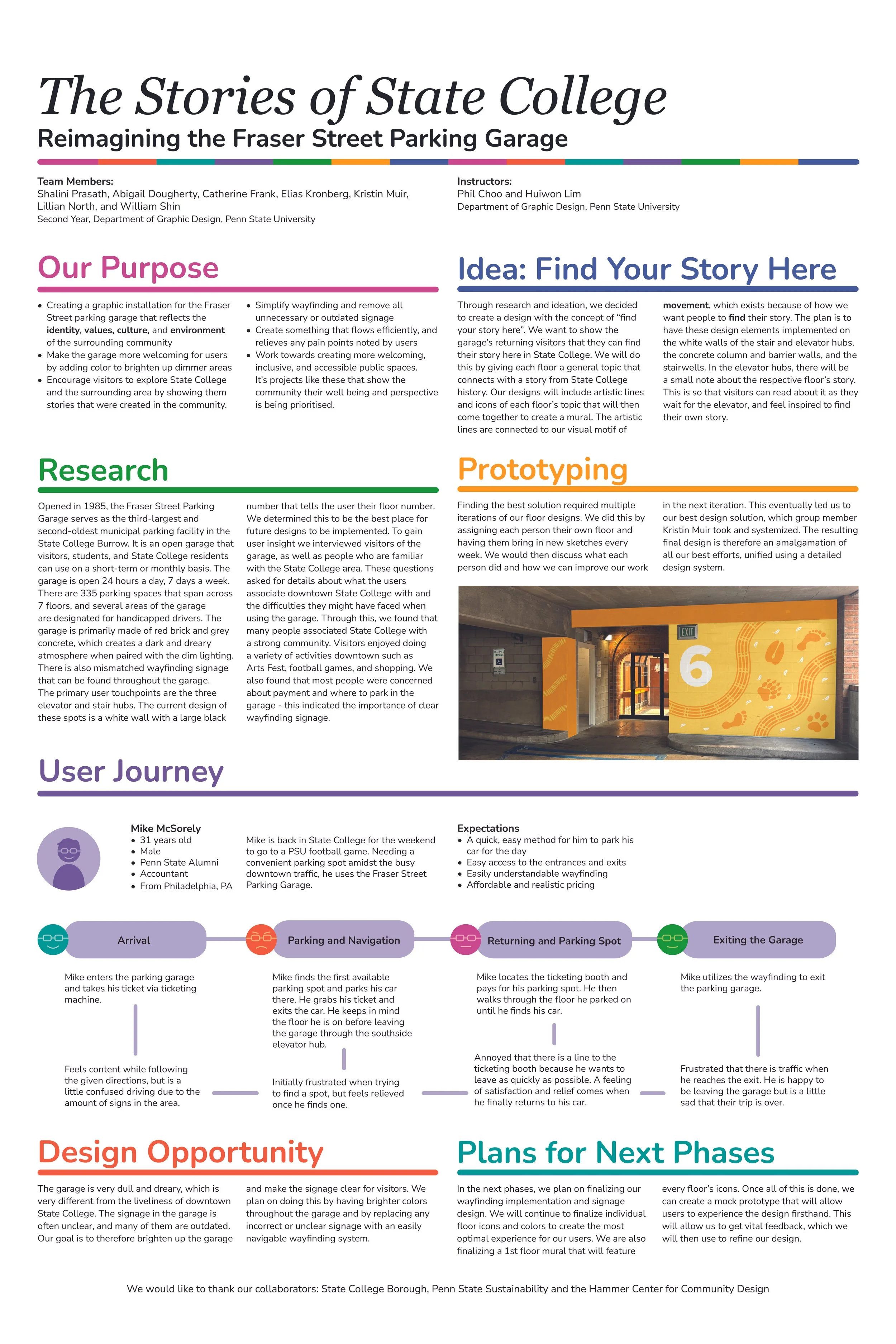 In this group project, we worked with the State College Bureau to connect the frequently used Frasier Street parking garage to the community. The garage was very dull and lacked proper signage, not reflecting the unique and diverse culture downtown State College has to offer. The garage is used by a variety of people, such as current students, locals, alumni, fans, and friends.