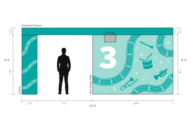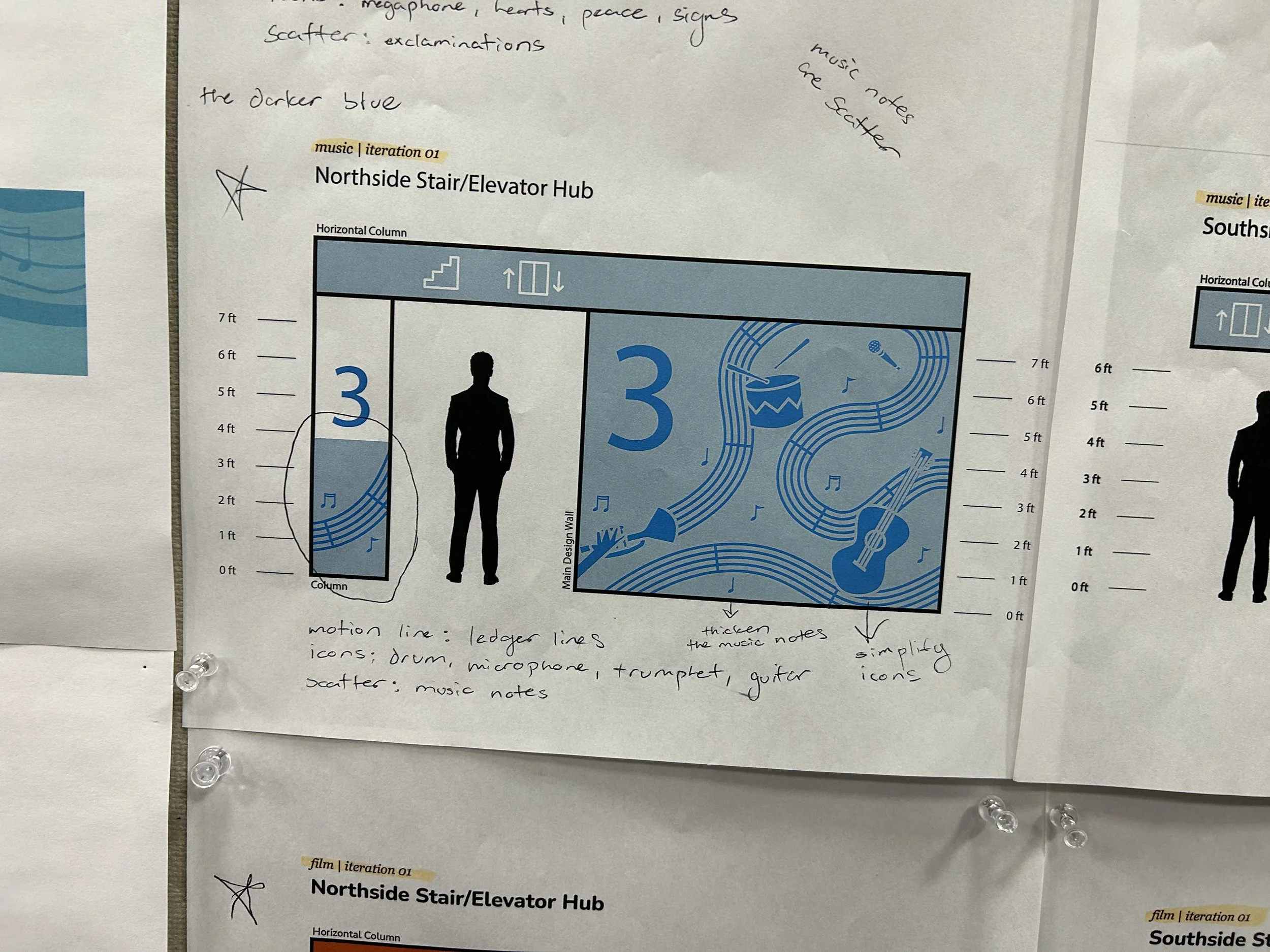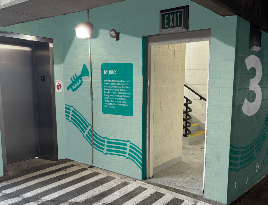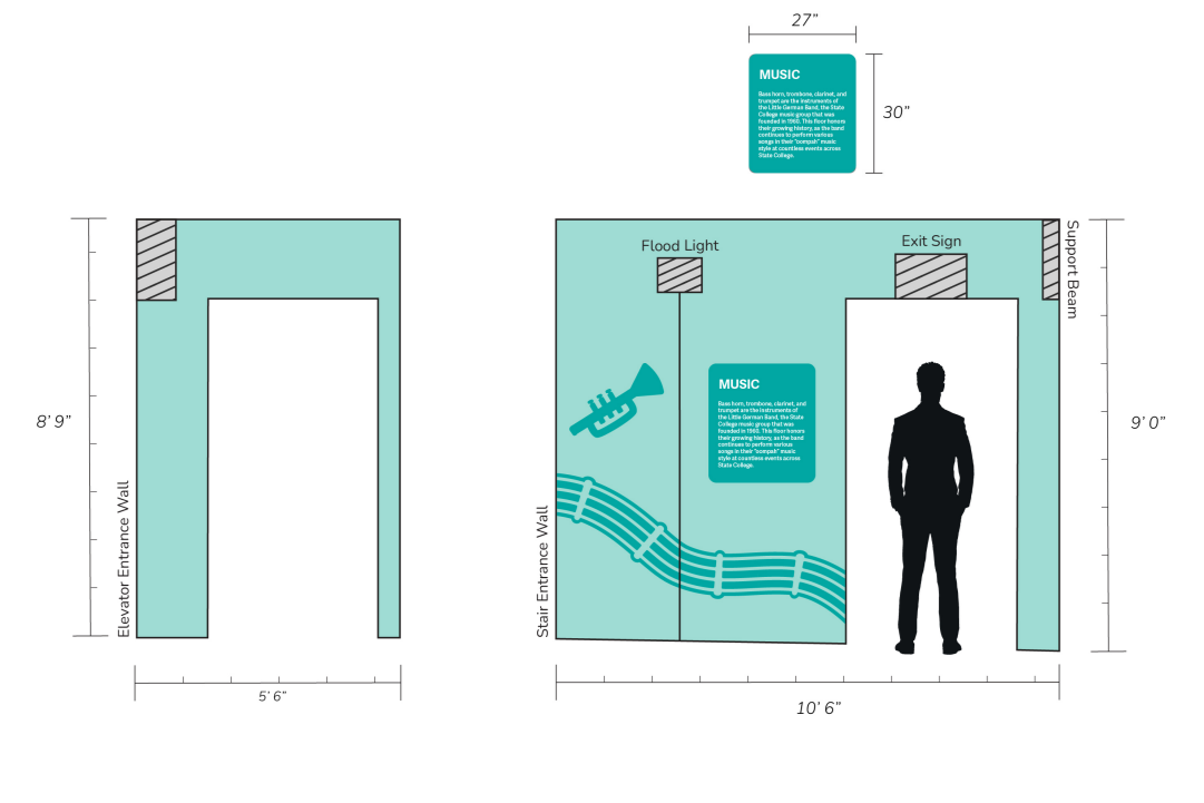 Everyone in the group focused on their own floor. My floor’s focus was music. I did this by creating measure lines as the leading motion lines. I created icons of different instruments used in State College’s "Little German Band,” which was founded in 1960.