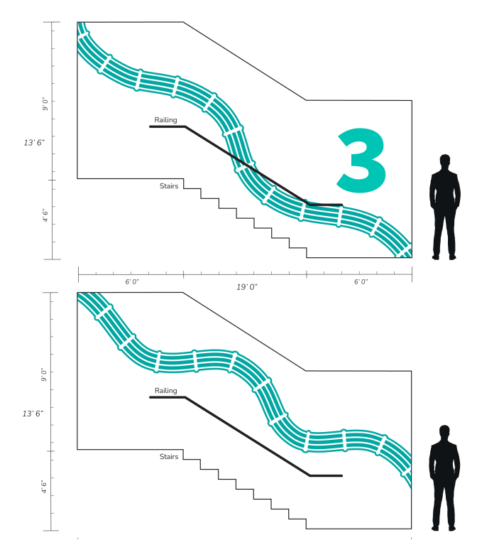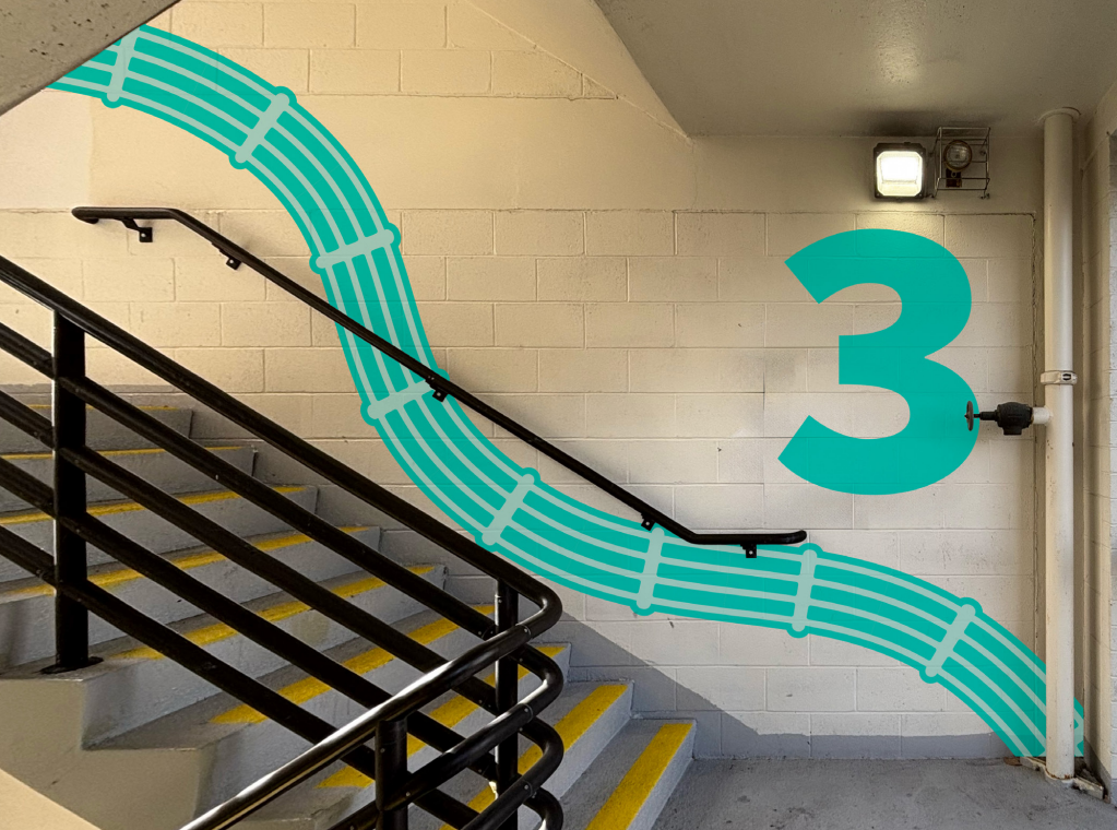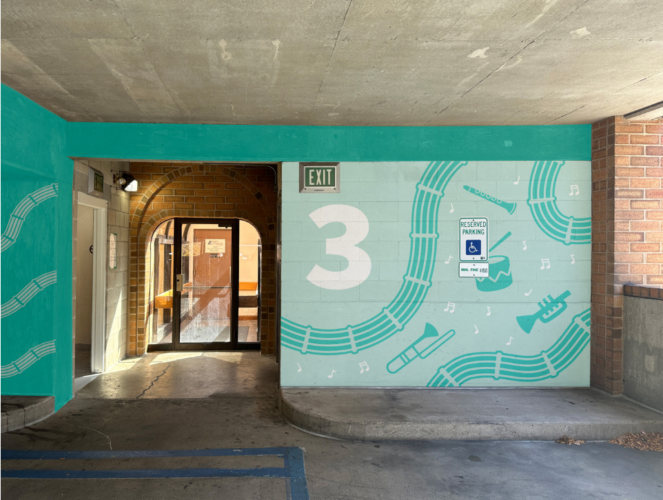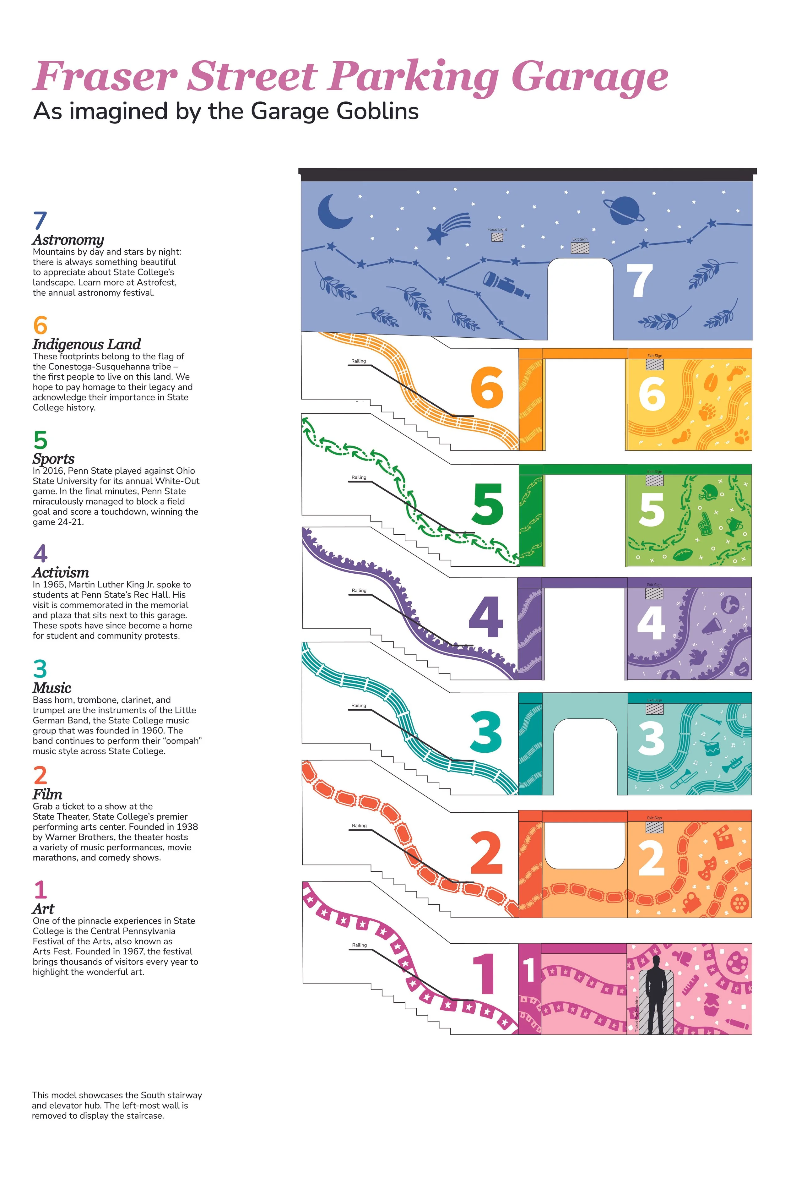 We chose to address this goal of displaying the community by focusing on some of State College’s most well-known themes, one for each floor. We focused on art, film, music, activism, sports, indigenous land, and astronomy. We connected different stories to each topic and displayed them in each elevator hub so the user would be able to both learn something new and give them something to remember what floor they’re parked on. We also included motion lines within each floor design, connecting the idea of movement as well as supporting wayfinding throughout the garage.