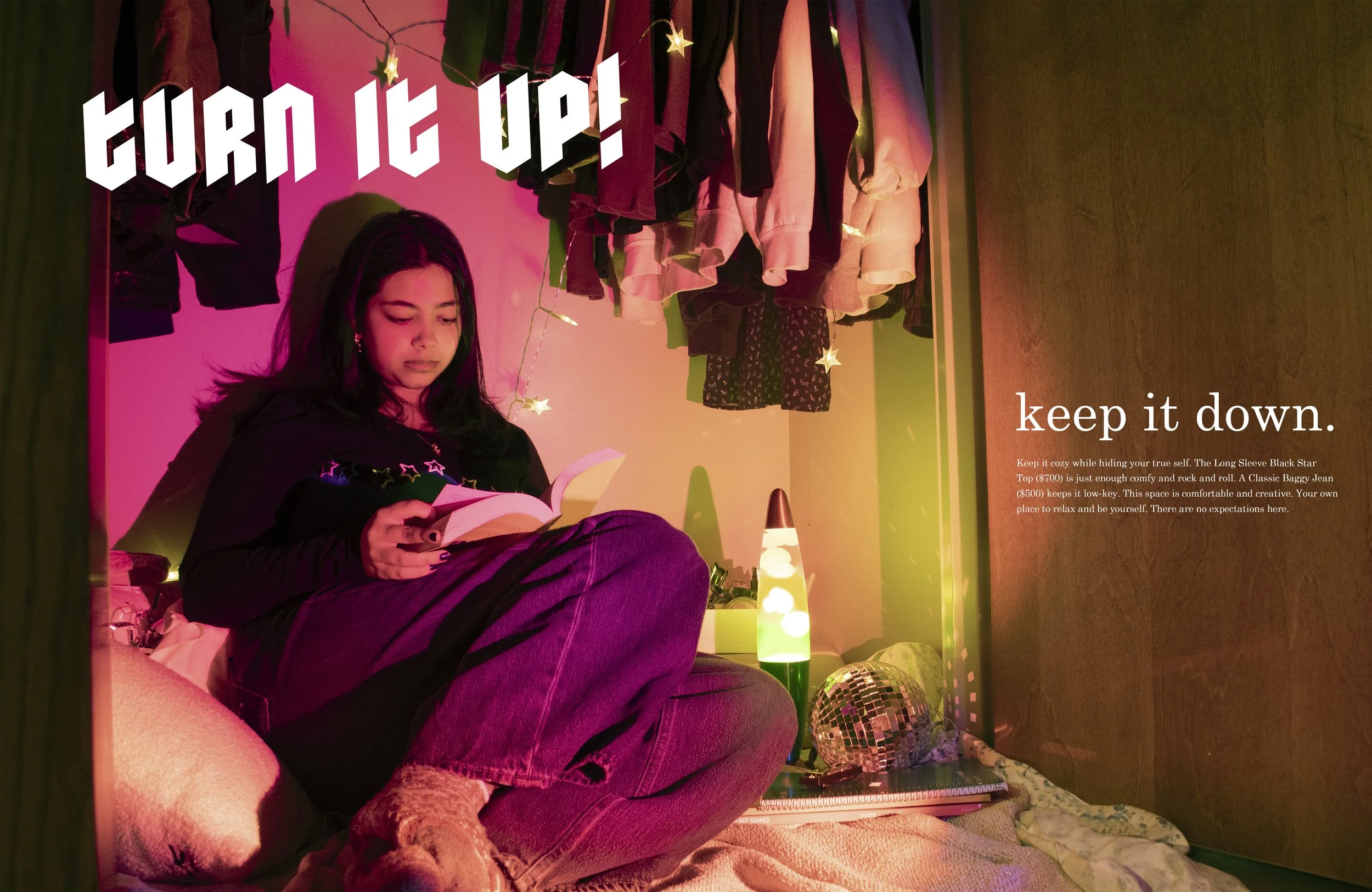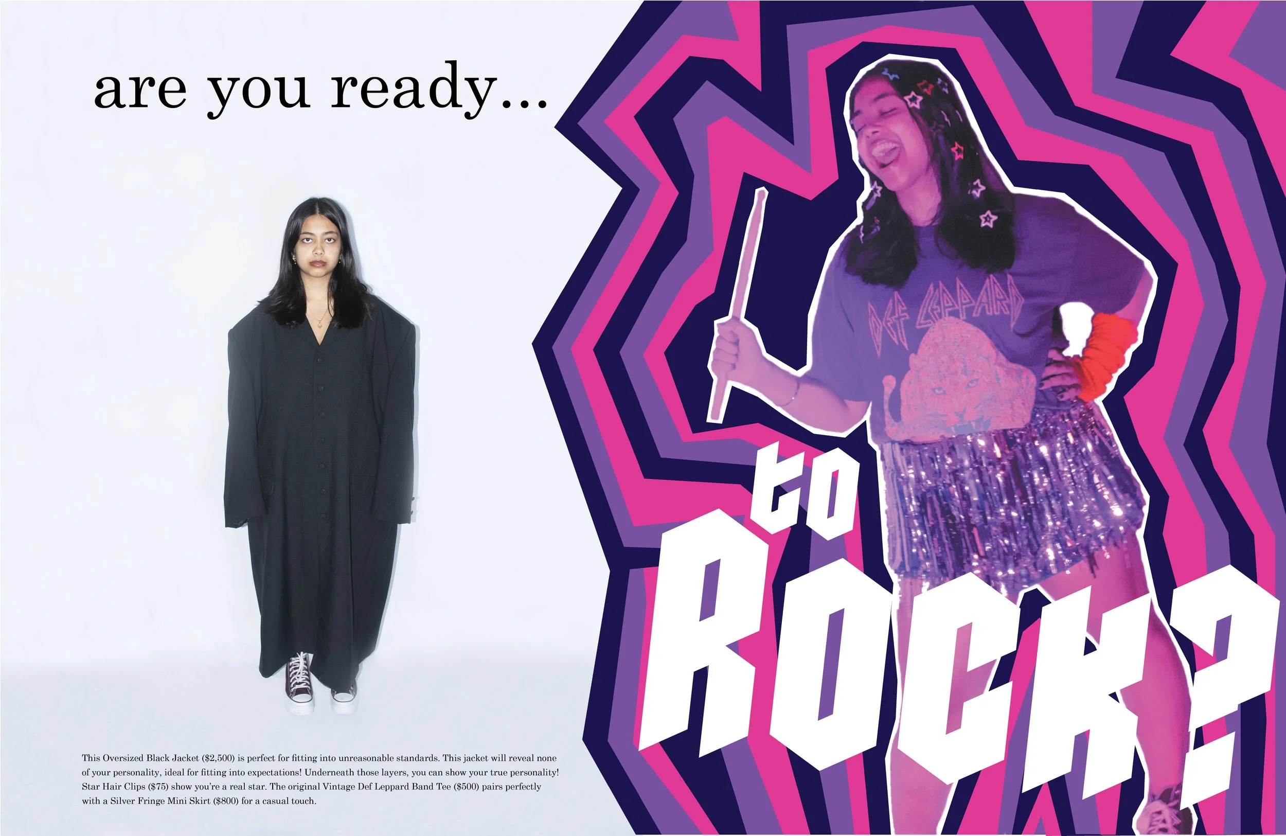 In this project, I was prompted to create a couture fashion magazine with the goal of promoting a movie or TV show. This fashion magazine is based on the character Lane Kim from the TV show Gilmore Girls. The character had to hide her true interests and personality from her mother. Lane Kim loved all music, especially rock and roll, and wearing bright colors and band tees. Her mother was strict and expected her to fit into a small box. This fashion magazine highlights the transition between being her true self and hiding from her mother.